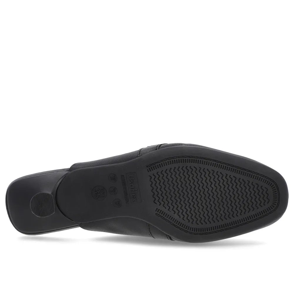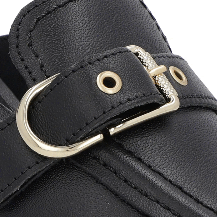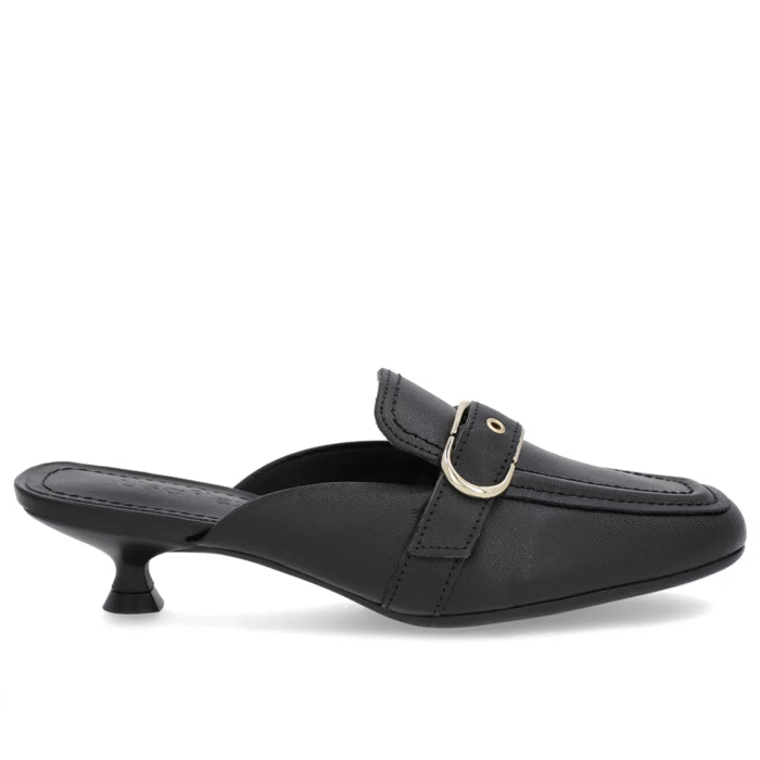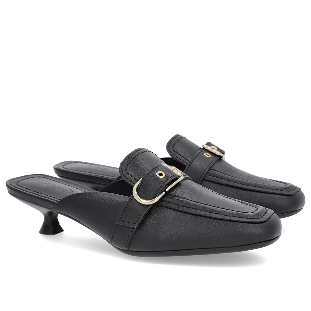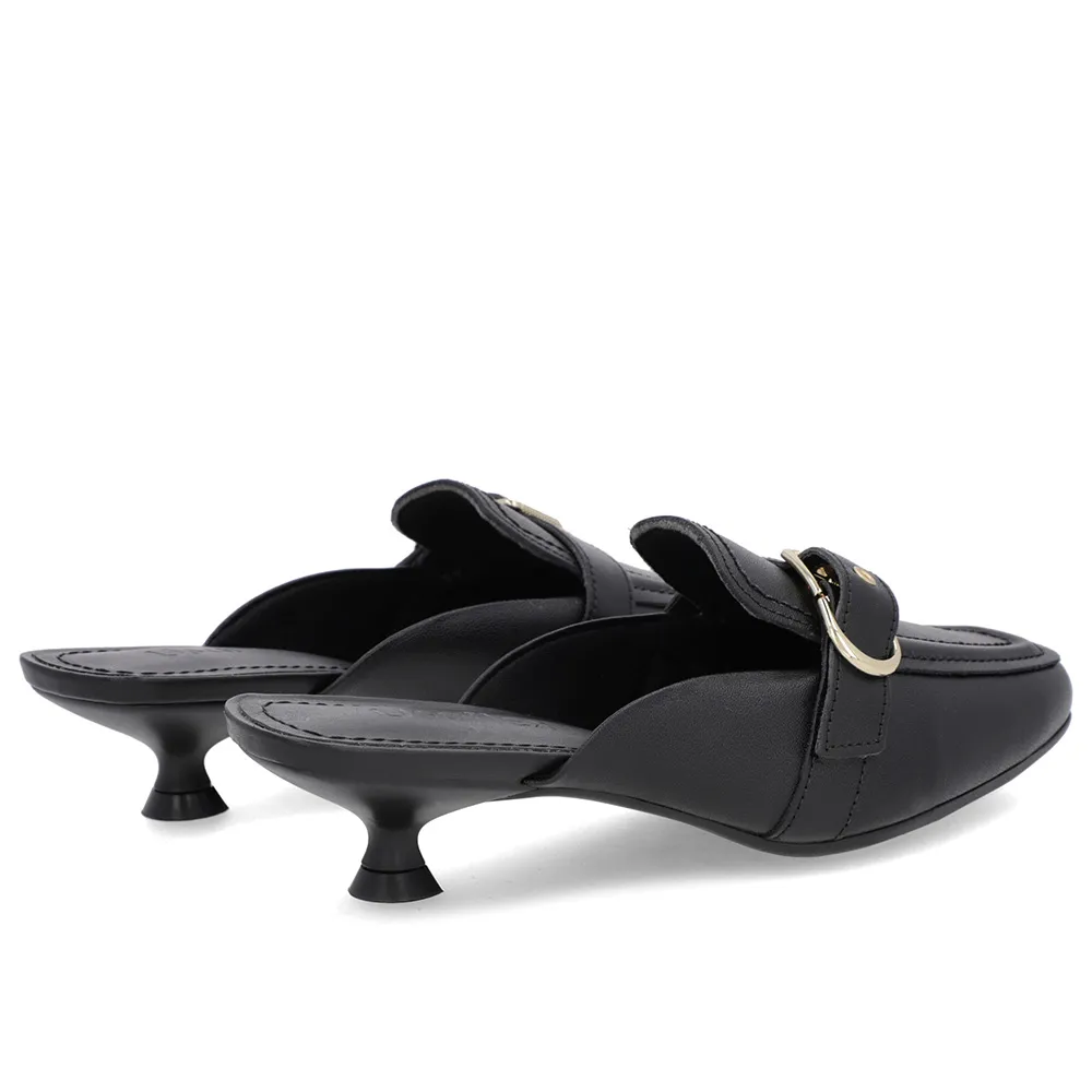 Mule Preta Couro Salto Kitten Fivela