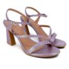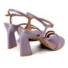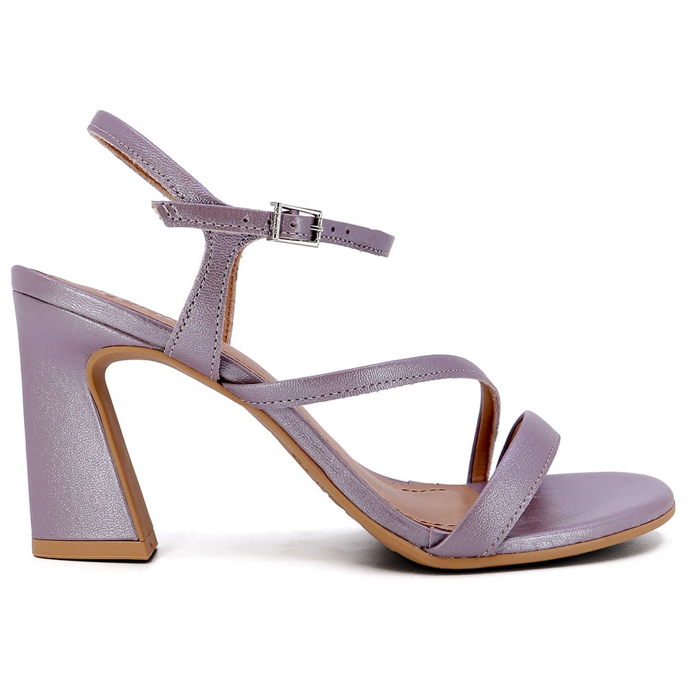 Sandalia salto alto com cabedal em couro perolado na cor ametista. O modelo possui tecnologia Memória Permanente. com material de capacidade de retorno e mantêm o formato dos seus pés na palmilha.