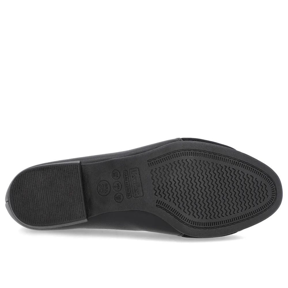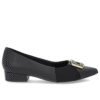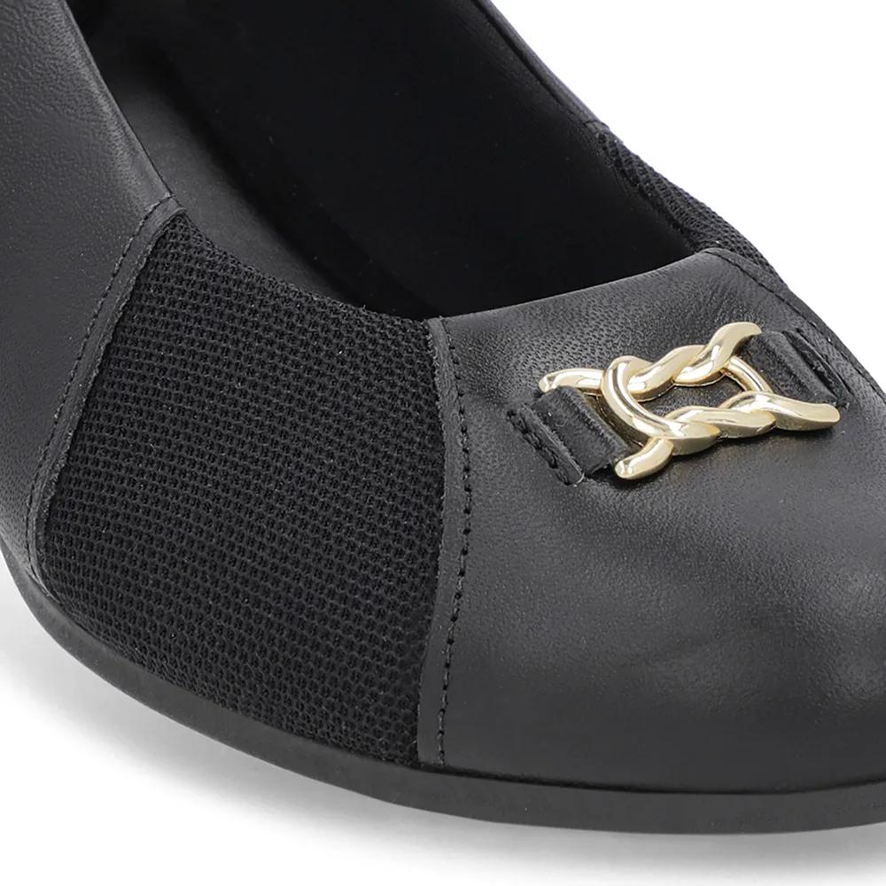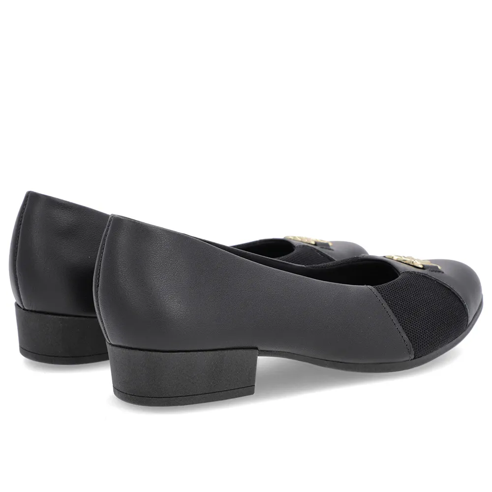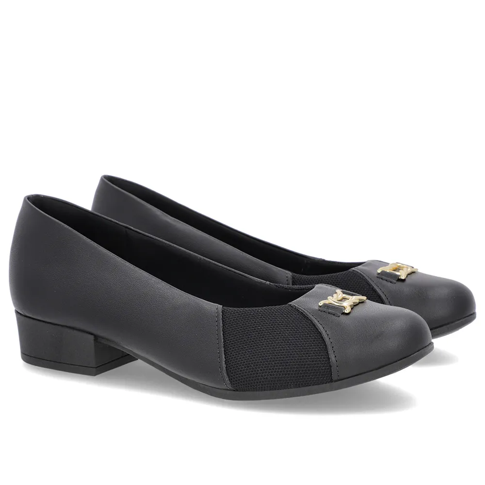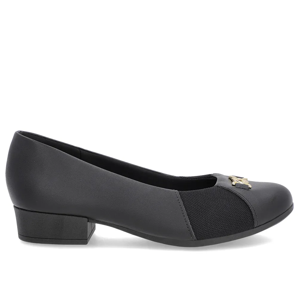 Scarpin Preto Couro Bico Redondo Tecido Lateral