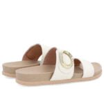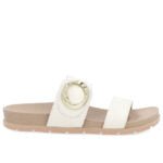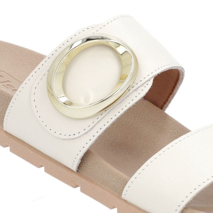 Slide cabedal em couro napa valise na cor marfim. O modelo possui tecnologia Sola+Conforto. desenvolvida para amenizar o impacto gerado pelas irregularidades do solo. os solados com espessura extra mantêm os pés confortáveis durante todo o tempo de uso do sapato.