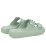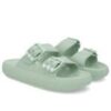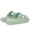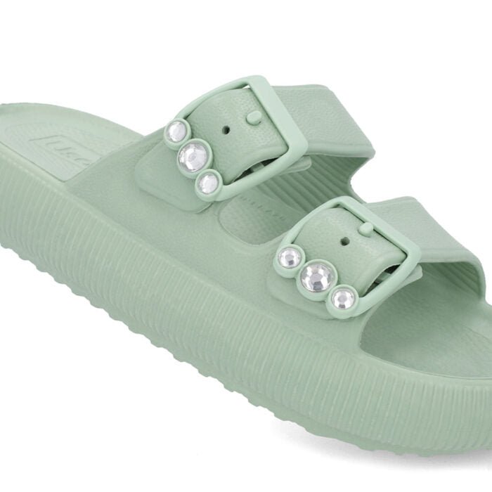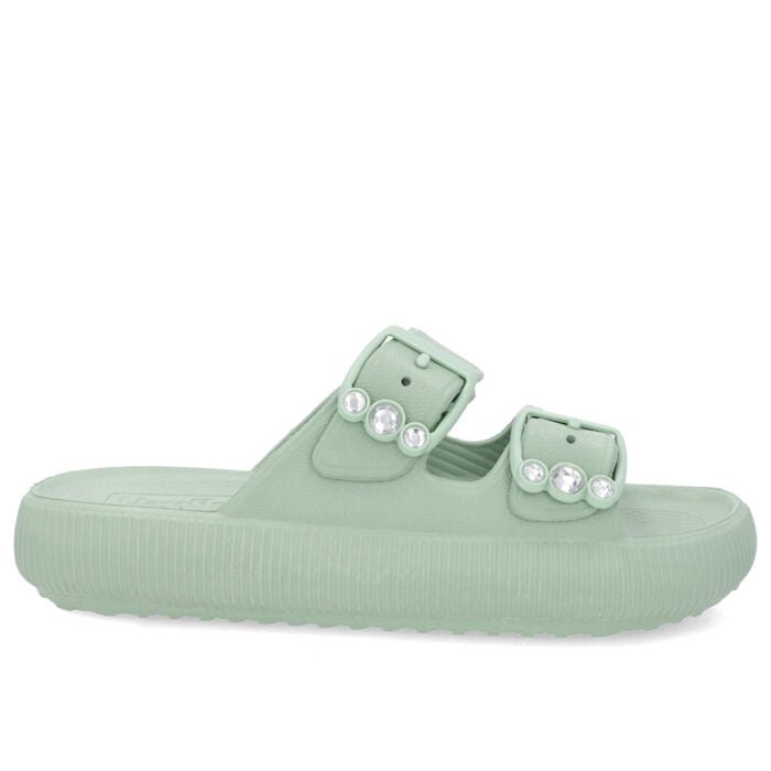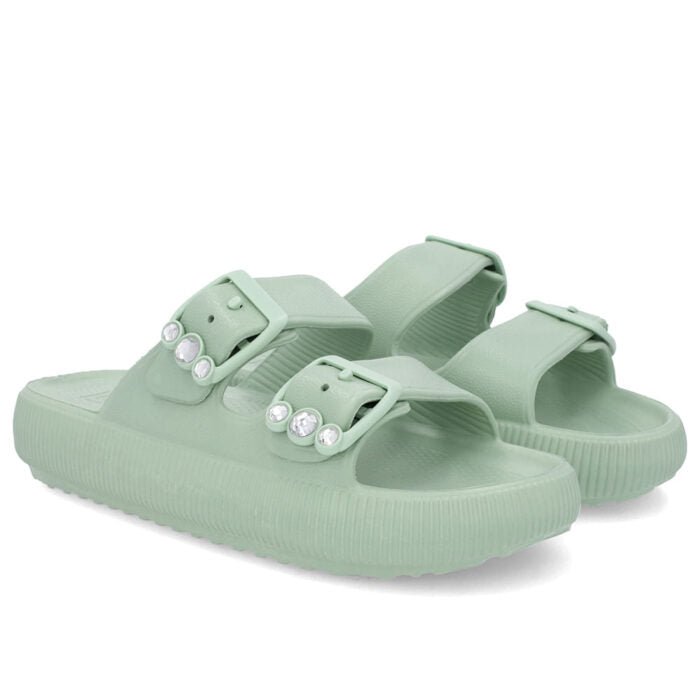 Chinelo plataforma em material eva na cor menta.O modelo tem salto rasteiro.possui bico redondo. Traz tiras largas sobre os dedos e no peito do pé. possuindo fivelas quadradas laterais com um detalhe charmoso em pedra strass.