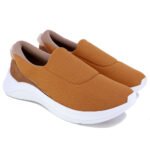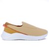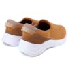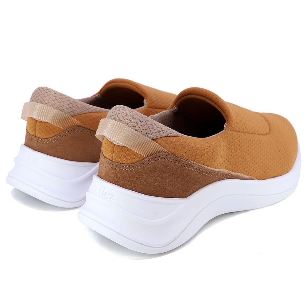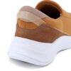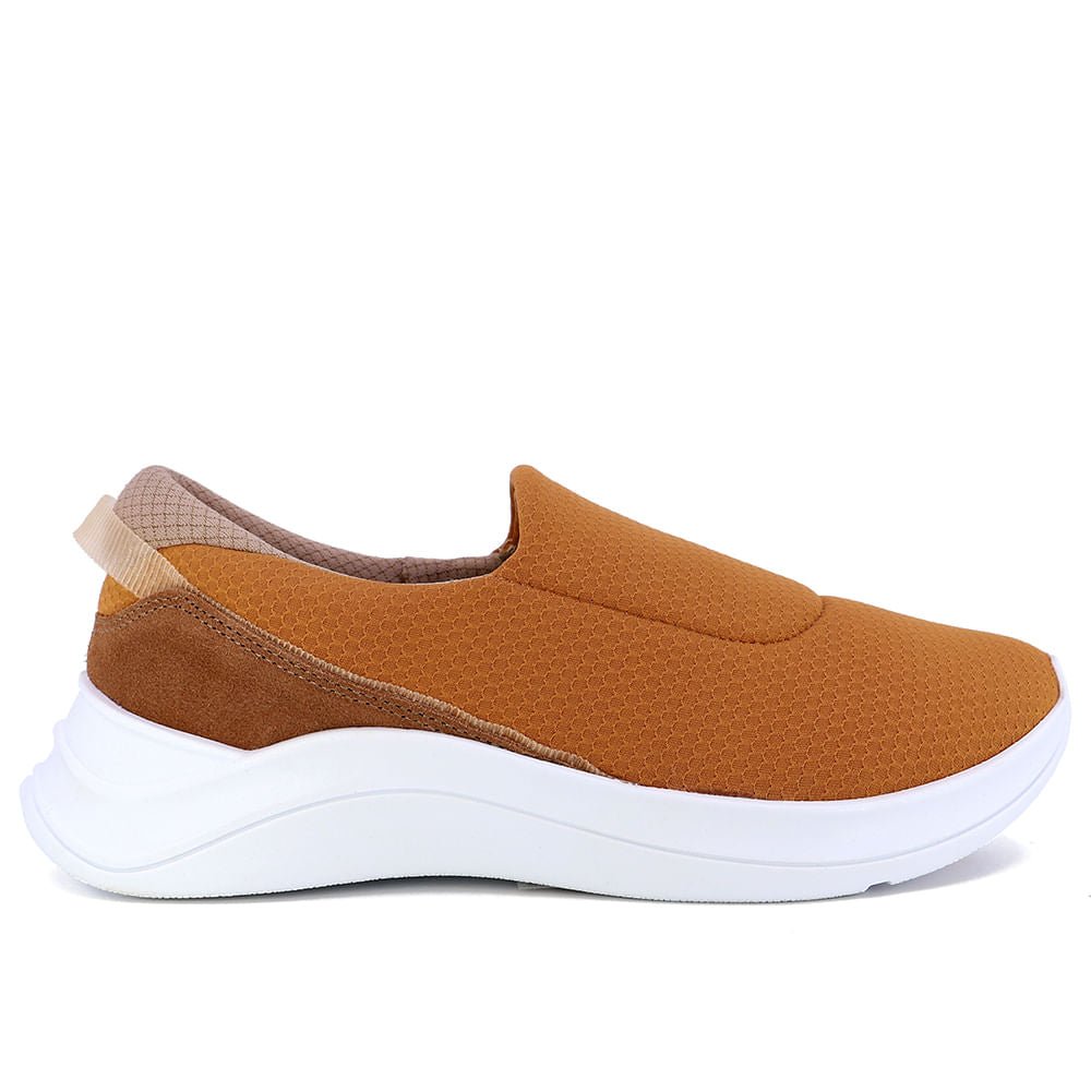 Tenis com cabedal em tecido tan e couro camurça na cor camel. O modelo possui tecnologia Ativ+ar. que permite a circulação interna do ar. auxiliando na redução da sensação de calor e promovendo a rápida dessorção.